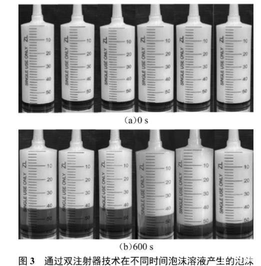 圖3通過(guò)雙注射器技術(shù)在不同時(shí)間泡沫溶液產(chǎn)生的泡沫