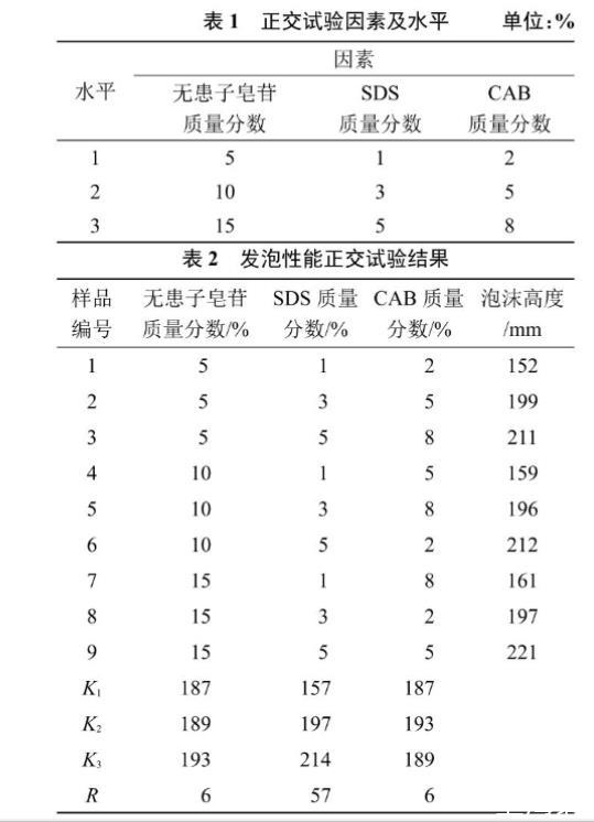 根據(jù)正交表測(cè)定其發(fā)泡高度,結(jié)果見(jiàn)表2。表2中K1、K2、K3表示各因素在相應(yīng)水平下評(píng)價(jià)指標(biāo)的平均值,R為各因素相應(yīng)水平下評(píng)價(jià)指標(biāo)的級(jí)差。發(fā)泡高度的極差R值表明,各因素的重要性依次為SDS>CAB=無(wú)患子皂苷,SDS對(duì)復(fù)配體系的發(fā)泡性能影響最大。由表2中發(fā)泡高度的K值可見(jiàn),發(fā)泡性能最佳的組合是第9組。表面活性劑復(fù)配后隨著其添加量的增加,空氣與液膜之間的活性劑分子濃度增加,有利于提高泡沫溶液的發(fā)泡能力[9]。