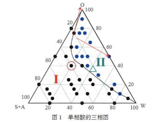 通過(guò)擬三元相圖制備單相酸相圖,根據(jù)油相(O)、酸相(W)、表面活性劑(S)+助表面活性劑(A)的比例進(jìn)行三相圖的繪制。室溫下,固定油相(O)的加量,固定非離子表面活性劑(S1)與陽(yáng)離子表面活性劑(S2)的質(zhì)量比,固定表面活性劑(S,S=S1+S2)與助表面活性劑(A)的質(zhì)量比。將不同比例下的液體進(jìn)行離心,然后進(jìn)行觀測(cè),觀察體系由澄清透明(一相)變?yōu)榛鞚幔ǘ啵┑南嘧冞^(guò)程,在每次發(fā)生相變的同時(shí)記錄所滴加鹽酸的量,以O(shè)、S+A、W為三相,繪制擬三元相圖,見(jiàn)圖1。由圖1可知,在圖1的紅圈標(biāo)記區(qū)域,配方的經(jīng)濟(jì)性最好,是維持單相區(qū)域最小的表面活性劑用量(S+A),且該配方下的單相酸遇水遇油后仍可在較大范圍內(nèi)保持單相。
