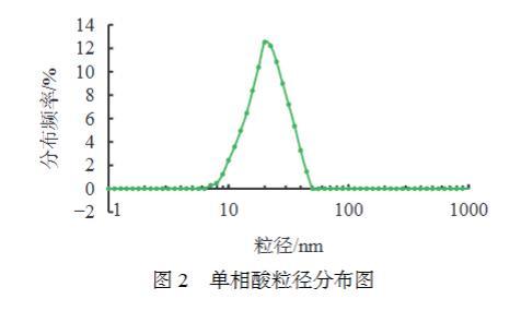 采用激光粒度分析儀對(duì)單相酸粒徑及分布進(jìn)行了測(cè)定,實(shí)驗(yàn)結(jié)果見(jiàn)圖2。可知單相酸粒徑大小分布在7~50 nm范圍之內(nèi),分布較窄,為高斯分布,在單相微乳粒徑范圍內(nèi)。