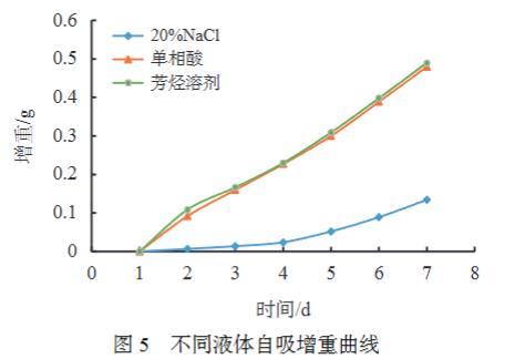 設(shè)置不同液體進(jìn)行自吸實(shí)驗(yàn),對(duì)比親油巖心對(duì)于不同液體的自吸能力,實(shí)驗(yàn)結(jié)果見(jiàn)圖5。對(duì)孔隙介質(zhì)而言,潤(rùn)濕性控制兩相或多相流體的分布和流動(dòng)。平衡時(shí)濕潤(rùn)相與孔隙表面相互接觸,而非濕相占據(jù)孔隙的中央位置,介質(zhì)中發(fā)生兩相或多相流動(dòng)時(shí),毛管力與濕相流動(dòng)方向一致,是非濕相自發(fā)進(jìn)入巖心介質(zhì)驅(qū)替潤(rùn)濕相的阻力,對(duì)于油濕巖心介質(zhì),很難發(fā)生水的自吸。從實(shí)驗(yàn)結(jié)果可以看出,單相酸自吸效果和芳烴溶劑十分接近。