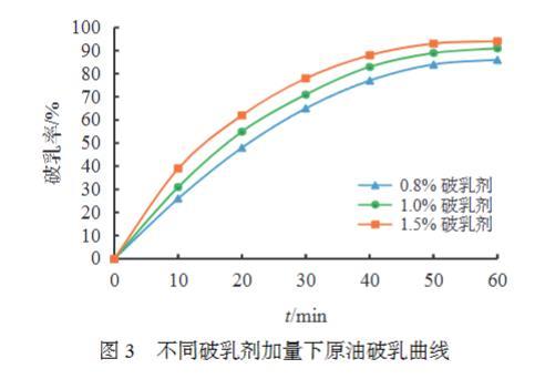 將單相酸與原油高速攪拌混合制備乳狀液,油水比3∶2。分別加入0.8%、1.0%、1.5%二酸二辛脂磺酸鈉破乳劑,水浴90℃,靜態(tài)放置,每隔10 min測(cè)量析出量,計(jì)算破乳率,實(shí)驗(yàn)結(jié)果見(jiàn)圖3。加入1%破乳劑后,單相酸破乳率在1 h內(nèi)可達(dá)到90%以上。