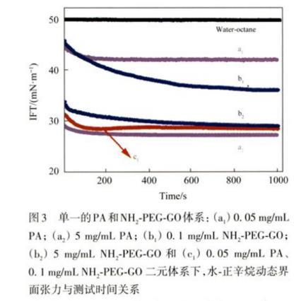 在25℃條件下,測得水和正辛烷之間的界面張力為50.7 mN/m(圖3),與之前研究中報道的界面張力值51.16 mN/m非常接近。為了研究PA與NH2-PEG-GO在共存時對界面張力的影響,分析了0.05 mg/mL PA、0.1 mg/mL NH2-PEG-GO各自對界面張力的影響。圖3顯示PA與NH2-PEG-GO均具有界面活性,能夠吸附到水-正辛烷界面上,降低界面張力。同時也觀察到:0.05 mg/mL PA降低界面張力速率快,平衡時間較短(<200 s),界面張力曲線呈現(xiàn)先快速下降后平衡的趨勢,而當0.1 mg/mL NH2-PEG-GO存在于溶液中時,界面張力降低速率較慢,大約在700 s后達到平衡。分析發(fā)現(xiàn),界面張力隨著時間的演變呈現(xiàn)先快速下降,后緩慢下降,最后平衡的特點,這表明接近吸附平衡時出現(xiàn)勢壘,減緩了粒子在界面上的進一步吸附。這種吸附勢壘由多種因素導致,通常與已吸附在界面上的分子所產(chǎn)生的表面壓以及隨著界面密度提高,分子取向的改變相關。同時在吸附后期,可供吸附的界面面積減少,已經(jīng)吸附到界面上的粒子必須重新排列以空出足夠的空間供額外的粒子進行吸附。這種重排的速率是由粒子的面內遷移率決定的,即粒子在界面上的擴散系數(shù)。該擴散系數(shù)通常要小于粒子在本體中的擴散系數(shù),并與粒子尺寸、粒子表面配體修飾等相關。