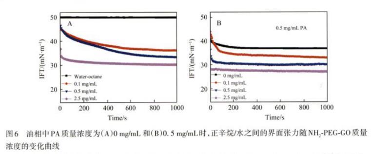 研究了PA和NH2-PEG-GO共存時(shí)界面張力的變化規(guī)律。測(cè)試了當(dāng)PA在油相中質(zhì)量濃度為0.5 mg/mL時(shí),NH2-PEG-GO質(zhì)量濃度變化對(duì)水-油界面張力的影響(圖6B),并與不添加PA時(shí)(圖6A)的情況進(jìn)行了對(duì)比。發(fā)現(xiàn)0.5 mg/mL PA的添加,使得界面張力平衡時(shí)間明顯縮短,從大約700 s縮短為小于200 s,并且PA的添加,使得0.1和0.5 mg/mL NH2-PEG-GO在t<300 s時(shí)的界面張力下降曲線發(fā)生變化,此時(shí)0.5 mg/mL NH2-PEG-GO條件下,界面張力值更低,界面張力平衡時(shí)間更短(圖6B)。這是由于在界面上優(yōu)先吸附的PA與NH2-PEG-GO之間存在靜電相互作用,PA上的羧基能夠吸引更多帶氨基的NH2-PEG-GO向界面吸附,使界面被更快、更有效地覆蓋,因此二者之間具有協(xié)同相互作用。但0.5 mg/mL PA的存在對(duì)由NH2-PEG-GO吸附引起的平衡界面張力僅比不添加PA時(shí)降低了約3 mN/m。這意味著界面張力的降低主要是由于NH2-PEG-GO吸附導(dǎo)致的??梢酝茰y(cè),PA在水-油界面上更傾向于吸附到NH2-PEG-GO上,因此基本不影響平衡界面張力值。