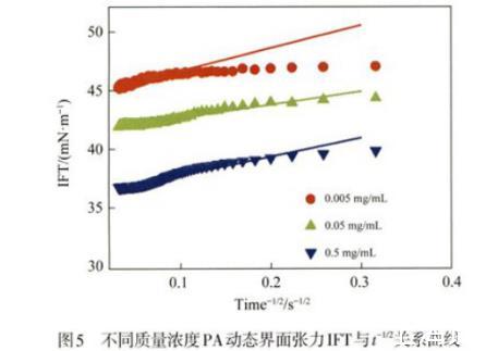 用同樣的方法,根據(jù)圖5中不同質(zhì)量濃度PA動(dòng)態(tài)界面張力隨時(shí)間t-1/2變化,計(jì)算了PA向界面運(yùn)動(dòng)的擴(kuò)散系數(shù)DPA,計(jì)算得到的DPA~1×10-10 m2/s,與表1中估算得到的PA擴(kuò)散系數(shù)為同一數(shù)量級(jí),這表明在低質(zhì)量濃度條件下,PA向界面吸附運(yùn)動(dòng)為擴(kuò)散控制過程,這與之前文獻(xiàn)中報(bào)道的現(xiàn)象相一致。本節(jié)進(jìn)行的單組分吸附動(dòng)力學(xué)解析將為下面的多(雙)組分共吸附動(dòng)力學(xué)提供基準(zhǔn)和校準(zhǔn)。